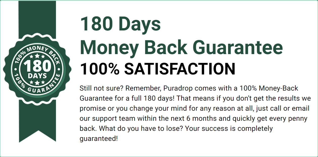 Puradrop comes with a 180 Day, 100% Money Back Guarantee. That means if you decide you don’t like the product at any point in the next six months – all you need to do is email us and return your order, and we’ll refund your entire purchase.